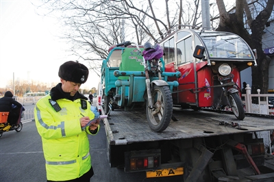 2017年12月13日,崇文門路口交警在登記被查扣上路行駛的非法機動三輪車和電動三輪車。新京報記者 王貴彬 攝