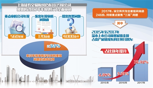 隨著上市公司年報披露季結束,證券交易所對公司的年報審核也隨之進入高峰。目前,審核工作基本完成。上海證券交易所全面審閱了滬市1419家公司披露的2017年年報,重點審核了560多家公司年報,發(fā)出年報審核問詢函170余份,提出各類問題4000余個,全部審核問詢函均對外公開。值得關注的是,“三高”(高估值、高商譽、高業(yè)績)并購后遺癥十分明顯。