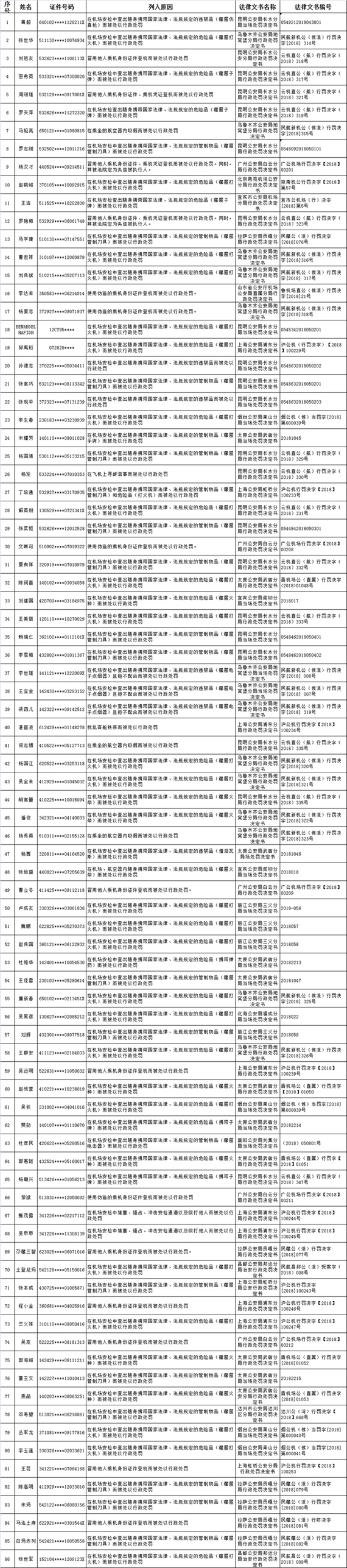 據(jù)民航局網(wǎng)站消息,6日1日,民航局公布首批《民航限制乘坐民用航空器嚴(yán)重失信人名單》,86人因“在機(jī)場(chǎng)安檢中查出隨身攜帶國(guó)家法律、法規(guī)規(guī)定的危險(xiǎn)品、違禁品、管制物品而被處以行政處罰”、“冒用他人乘機(jī)身份證件、乘機(jī)憑證登機(jī)而被處以行政處罰”等行為被列入民航特定嚴(yán)重失信人名單記錄,自6月1日起被限制乘坐民用航空器,限制期限為一年。