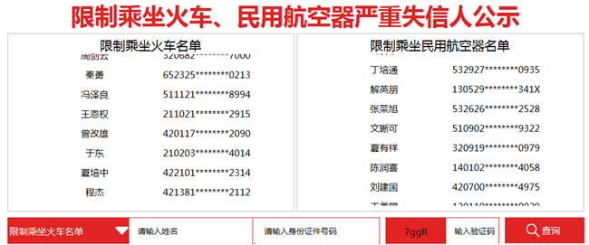 5月1日,國家發(fā)改委、鐵路總公司、民航局等部門聯(lián)合發(fā)布的《關于在一定期限內適當限制特定嚴重失信人乘坐火車 推動社會信用體系建設的意見》和《關于在一定期限內適當限制特定嚴重失信人乘坐民用航空器 推動社會信用體系建設的意見》正式實施。與此同時,中國鐵路總公司發(fā)布的《關于限制鐵路旅客運輸領域嚴重失信人購買車票的管理辦法》同步實施。