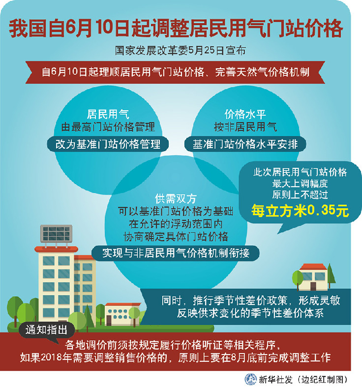 國家發(fā)展改革委5月25日宣布,自6月10日起理順居民用氣門站價格、完善價格機制。這是我國自2010年以來首次調整居民用氣門站價格,最大上調幅度原則上不超過每立方米0.35元。