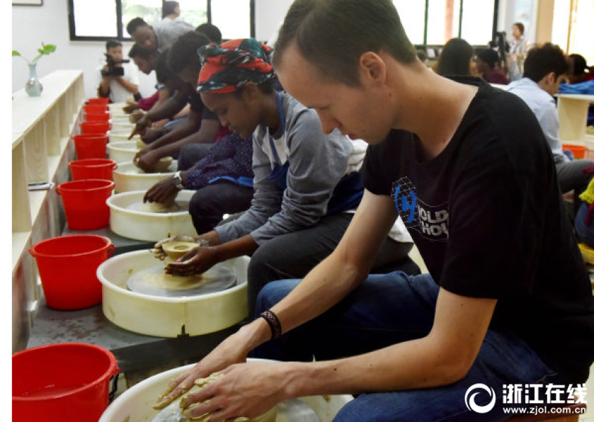 6月3日,浙師大外國留學(xué)生,在武義漢坊婺窯體驗館學(xué)陶藝。婺州窯,始于三國時期,是金華市第四批國家非物質(zhì)文化遺產(chǎn)代表性項目。當日,來自美國、俄羅斯等30多個國家的浙江師范大學(xué)70多名留學(xué)生,在武義漢坊婺窯體驗館開心學(xué)習(xí)拉坯、修坯、上釉等陶藝生產(chǎn)環(huán)節(jié)。留學(xué)生們還把自己的國籍、姓名刻在親手做的陶瓷器皿上,委托燒制、留作紀念。(拍友 張建成 攝)