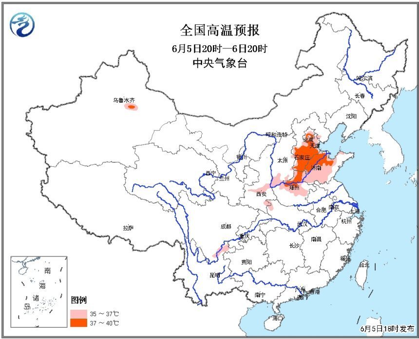 高溫天氣主要影響京津冀地區(qū)。5日至6日,北京、天津、河北中南部、山東北部和西部、河南北部以及陜西關(guān)中地區(qū)最高氣溫可達(dá)35℃~38℃,局地可達(dá)39℃~40℃。7日,高溫范圍收縮,主要影響河南北部、山東北部等地。