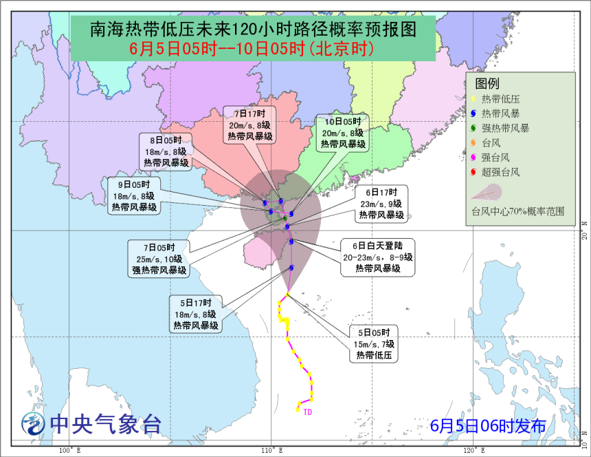 許映龍:南海的熱帶低壓于6月5日8時(shí)加強(qiáng)為今年第4號(hào)臺(tái)風(fēng)。5日16時(shí),第4號(hào)臺(tái)風(fēng)的中心位于海南省文昌市東偏南方向約85公里的海面上,中心附近最大風(fēng)力有8級(jí)(18米/秒)。目前,第4號(hào)臺(tái)風(fēng)以每小時(shí)20公里左右的速度向北偏西方向移動(dòng),并逐漸向我國(guó)海南東南部沿??拷⒂?日夜間至6日上午擦過或登陸海南東北部沿海(熱帶風(fēng)暴級(jí),20-23米/秒,8-9級(jí)),6日下午至7日早晨登陸廣東西部沿海(熱帶風(fēng)暴-強(qiáng)熱帶風(fēng)暴級(jí),20-25米/秒,8-10級(jí))。