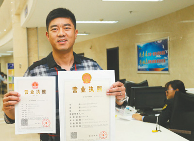 近日,山東省榮成市行政審批局正式掛牌成立,現(xiàn)場(chǎng)封存了相關(guān)部門(mén)29枚原審批專(zhuān)用章,“榮成市行政審批局”公章啟用。圖為榮成市市民領(lǐng)取一張加蓋“榮成市行政審批局”公章的營(yíng)業(yè)執(zhí)照。王福東 攝