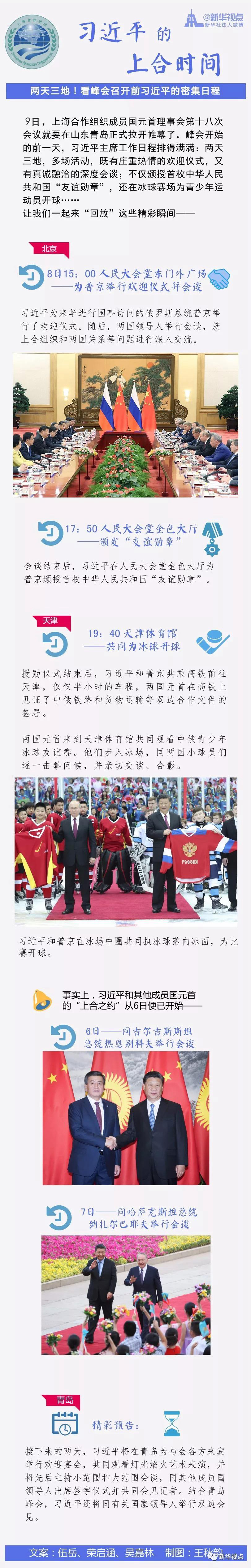 9日,上海合作組織成員國(guó)元首理事會(huì)第十八次會(huì)議就要在山東青島正式拉開(kāi)帷幕了。峰會(huì)開(kāi)始的前一天,習(xí)近平主席工作日程排得滿滿:兩天三地,多場(chǎng)活動(dòng),既有莊重?zé)崆榈臍g迎儀式,又有真誠(chéng)融洽的深度會(huì)談;不僅頒授首枚中華人民共和國(guó)“友誼勛章”,還在冰球賽場(chǎng)為青少年運(yùn)動(dòng)員開(kāi)球……讓我們一起來(lái)“回放”這些精彩瞬間????