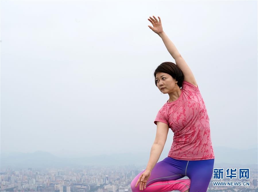 6月9日,在北京國貿(mào)大酒店頂層的83層停機坪,一名瑜伽愛好者在練習瑜伽。