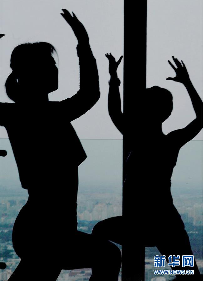 當(dāng)日,數(shù)名瑜伽愛好者在專業(yè)瑜伽教練的帶領(lǐng)下在北京國貿(mào)大酒店70層以上的高樓層練習(xí)瑜伽,體驗高空練習(xí)瑜伽的樂趣。