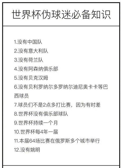 女:今天中午居然有同事問我“阿森納參不參加世界杯”。阿森納當(dāng)然不參加了,世界杯沒有俱樂部球隊(duì)。