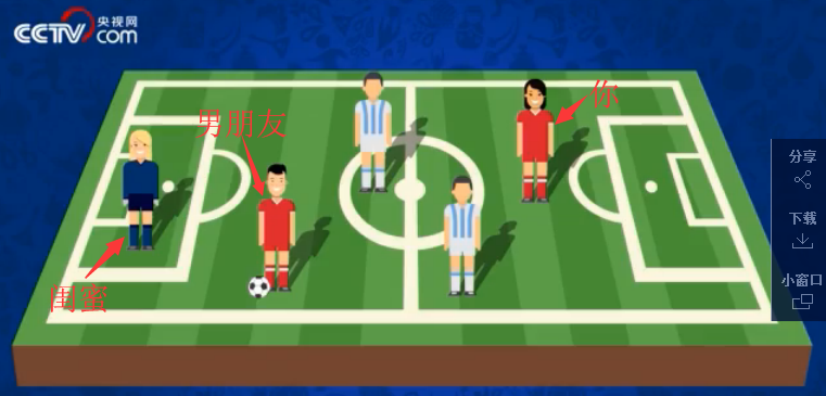 男:舉個(gè)例子,比如你和你的男朋友是一隊(duì),你的閨蜜是對方的守門員。當(dāng)你傳球給你男朋友時(shí),你男朋友比任何時(shí)候都更加靠近你閨蜜。此時(shí),你的男朋友就越位啦。
