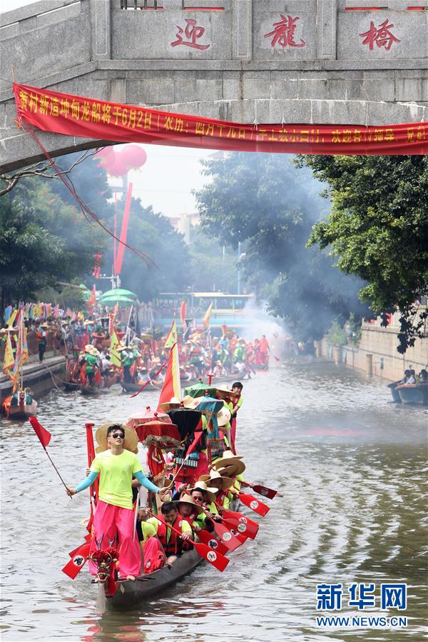 6月14日,在廣州天河區(qū)一處河道,一艘龍舟通過(guò)“迎龍橋”。當(dāng)日,廣州市天河區(qū)舉行一場(chǎng)熱鬧歡快的龍舟活動(dòng),來(lái)自多個(gè)村莊“走親戚”的龍舟隊(duì)參加。按廣州的傳統(tǒng)習(xí)俗,每年農(nóng)歷五月初一至初五,各村的龍舟隊(duì)要到周圍村落“走親戚”。走親戚的龍舟隊(duì)到來(lái)時(shí),受訪村子要準(zhǔn)備好龍舟飯招待來(lái)客?;顒?dòng)當(dāng)天,鳴炮敲鑼,一派喜慶氣氛。新華社記者 張加揚(yáng) 攝