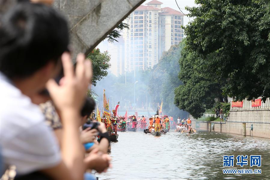 6月14日,觀眾在廣州市天河區(qū)一處河道旁等待龍舟通過。當(dāng)日,廣州市天河區(qū)舉行一場熱鬧歡快的龍舟活動,來自多個村莊“走親戚”的龍舟隊參加。按廣州的傳統(tǒng)習(xí)俗,每年農(nóng)歷五月初一至初五,各村的龍舟隊要到周圍村落“走親戚”。走親戚的龍舟隊到來時,受訪村子要準(zhǔn)備好龍舟飯招待來客?;顒赢?dāng)天,鳴炮敲鑼,一派喜慶氣氛。新華社記者 張加揚 攝