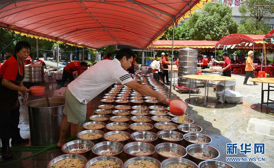 6月14日,工作人員在廣州天河區(qū)珠村七夕廣場準備龍舟飯。當日,廣州市天河區(qū)舉行一場熱鬧歡快的龍舟活動,來自多個村莊“走親戚”的龍舟隊參加。按廣州的傳統(tǒng)習俗,每年農歷五月初一至初五,各村的龍舟隊要到周圍村落“走親戚”。走親戚的龍舟隊到來時,受訪村子要準備好龍舟飯招待來客?;顒赢斕?,鳴炮敲鑼,一派喜慶氣氛。新華社記者 鄧華 攝
