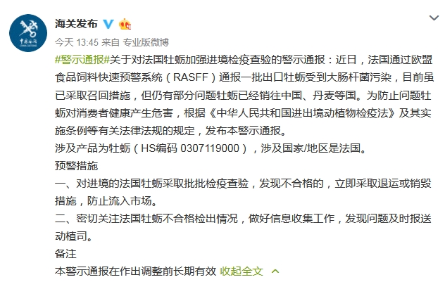 據(jù)中國海關(guān)總署辦公廳官方微博消息,海關(guān)總署今日發(fā)布關(guān)于對法國牡蠣加強(qiáng)進(jìn)境檢疫查驗的警示通報,通報稱,近日,法國一批出口牡蠣受到大腸桿菌污染,目前雖已采取召回措施,但仍有部分問題牡蠣已經(jīng)銷往中國、丹麥等國。通報預(yù)警措施,要求對進(jìn)境的法國牡蠣采取批批檢疫查驗,發(fā)現(xiàn)不合格的,立即采取退運或銷毀措施,防止流入市場。