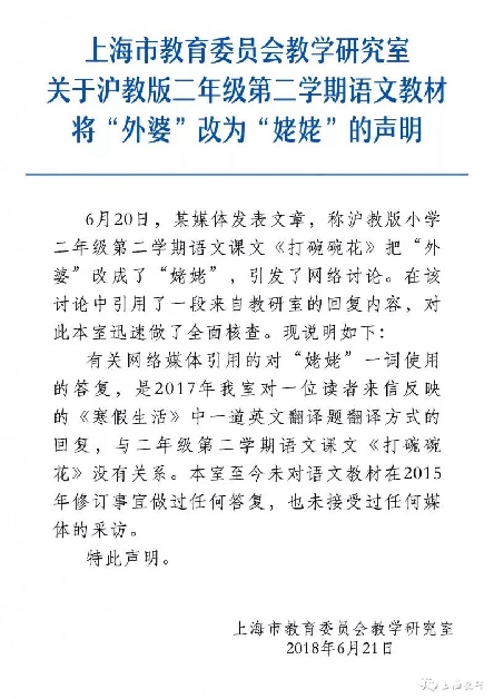 上海市教育委員會教學研究室表示,有關(guān)網(wǎng)絡(luò)媒體引用的對“姥姥”一詞使用的答復,是2017年教研室對一位讀者來信反映的《寒假生活》中一道英文翻譯題翻譯方式的回復,與二年級第二學期語文課文《打碗碗花》沒有關(guān)系。教研室至今未對語文教材在2015年修訂事宜做過任何答復,也未接受過任何媒體的采訪。