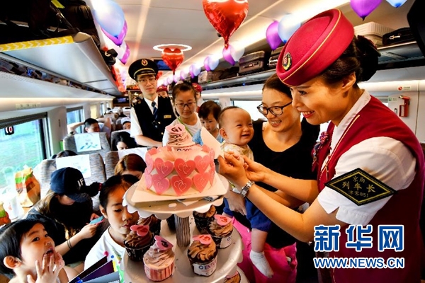 6月26日,在北京南至上海虹橋的G1次“復(fù)興號(hào)”列車上,乘務(wù)員與旅客一起切蛋糕慶祝。當(dāng)日,由北京南至上海虹橋的G1次“復(fù)興號(hào)”列車上舉行“復(fù)興號(hào)”運(yùn)營(yíng)一周年慶祝活動(dòng)。“復(fù)興號(hào)”是由中國(guó)鐵路總公司牽頭組織研制、具有完全自主知識(shí)產(chǎn)權(quán)、達(dá)到世界先進(jìn)水平的中國(guó)標(biāo)準(zhǔn)動(dòng)車組,自2017年6月26日投入運(yùn)營(yíng)以來(lái),以其良好的乘車體驗(yàn)廣受旅客歡迎。新華社發(fā)(楊寶森 攝)