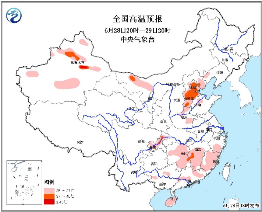 張芳華:昨天(6月27日),北京、天津、河北中南部、河南北部、山西中部、山東北部及江淮、江漢、江南中東部等地出現(xiàn)35℃至38℃高溫。