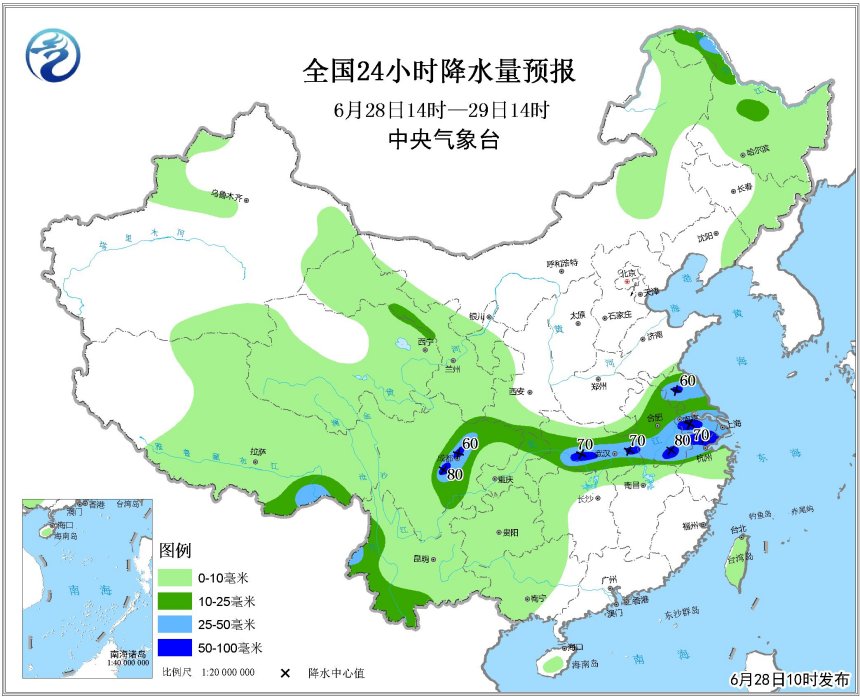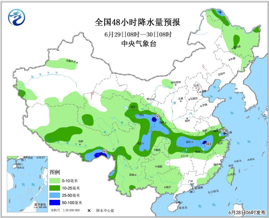 未來(lái),隨著天氣系統(tǒng)的緩慢南壓,主要降水區(qū)還將維持在江淮、江漢、江南北部。6月28日到7月1日,雨帶基本在上述區(qū)域擺動(dòng)。