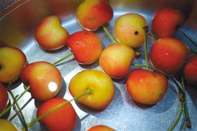 6月26日,鹽水浸泡中的櫻桃,沒有發(fā)現小蟲子。新京報記者 王嘉寧 攝