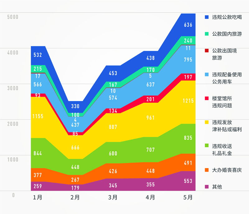 再來看,違反中央八項規(guī)定精神問題類型。從1至5月各類查處問題的面積分布圖來看,各類具體問題的查處趨勢也保持了較穩(wěn)定的增長態(tài)勢。值得注意的是,違規(guī)發(fā)放津補(bǔ)貼或福利、違規(guī)收送禮品禮金、違規(guī)配備使用公務(wù)用車、違規(guī)公款吃喝、大辦婚喪喜慶等問題類型,相比同期仍是所有問題類型的“大頭”(占據(jù)前5名),占比仍超80%。數(shù)據(jù)顯示,這些老問題,仍需下大氣力糾治,持之以恒,久久為功。