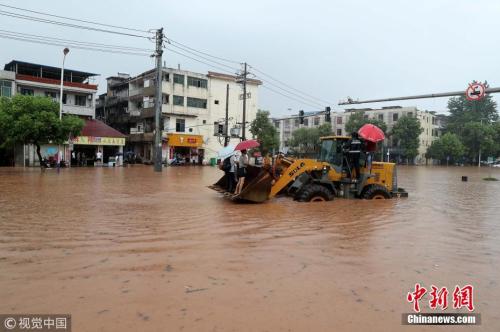 7月6日,江西省撫州市東鄉(xiāng)區(qū)遭遇特大暴雨襲擊,區(qū)城管局、水利局出動鏟車、皮滑艇等工具,幫助市民渡過積水路段。何江華 攝 圖片來源:視覺中國