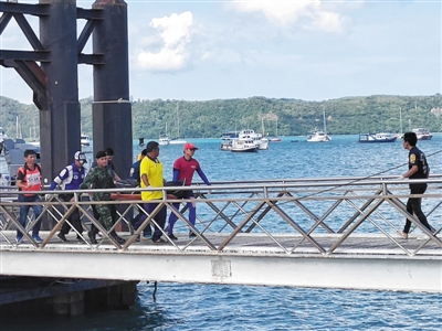 7月6日,泰國(guó)普吉島查龍碼頭,打撈船換成軍艦,船只無法靠岸更換碼頭,警察撤離該碼頭。 通訊員 卜志輝 攝