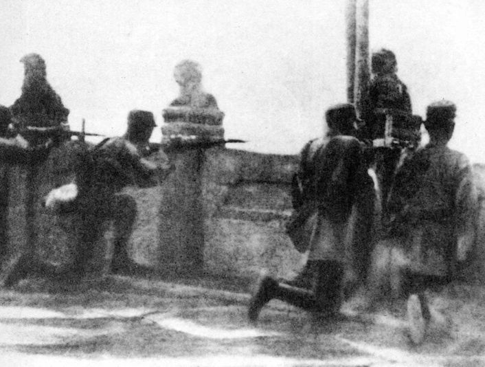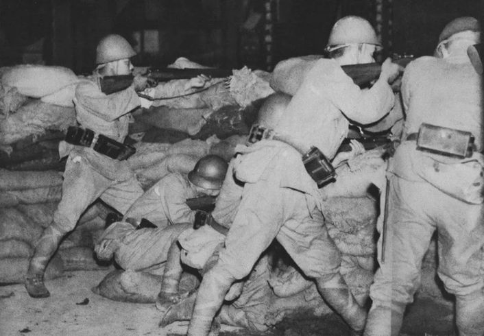 街頭掩體內(nèi)警戒的日軍士兵