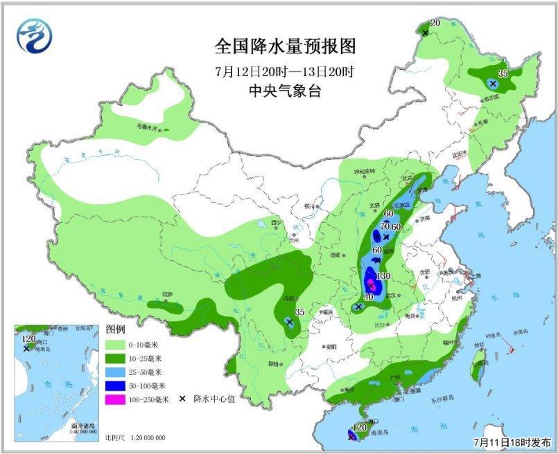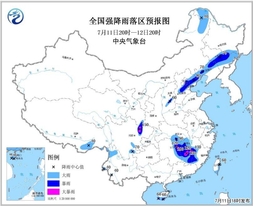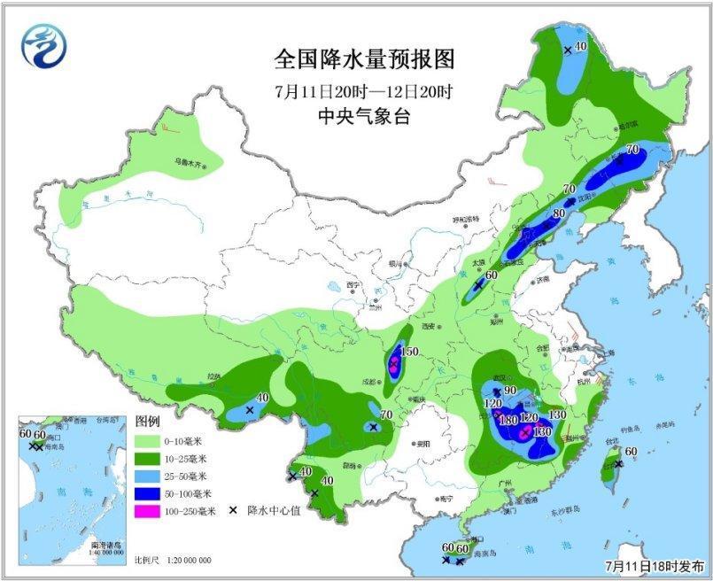 預計7月11日20時至12日20時,福建西部、江西、湖南東部、湖北東南部、四川盆地西北部和南部、山西中部、河北中部和東北部、北京東南部、天津中北部、遼寧西部和北部、吉林中東部以及海南島南部、云南西部等地有大雨或暴雨,其中,江西中部、湖南東北部、四川盆地西北部等地的局部地區(qū)有大暴雨(100~180毫米);上述地區(qū)最大小時降水量30~50毫米,局地60毫米以上(見圖1)。中央氣象臺7月11日18時繼續(xù)發(fā)布暴雨黃色預警。