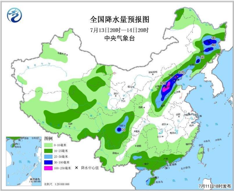 7月13日20時至14日20時,東北地區(qū)中南部、華北中東部、黃淮西北部、四川盆地西部等地有大到暴雨,局部有大暴雨(100~120毫米);上述局部地區(qū)將伴有短時強降水等強對流天氣(見圖4)。