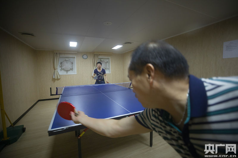 船員之家配有健身房,還有杠鈴、臂力器等器材,樓下還設(shè)有乒乓球室供船員們鍛煉。