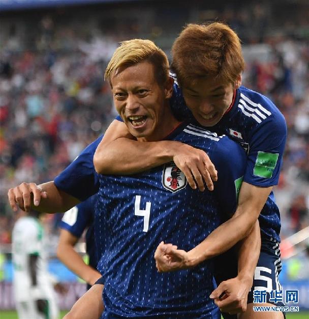 圖為2018年6月24日,在葉卡捷琳堡進(jìn)行的2018俄羅斯世界杯足球賽H組小組賽日本隊(duì)對(duì)陣塞內(nèi)加爾隊(duì)的比賽中,日本隊(duì)球員本田圭佑(左)在進(jìn)球后慶祝。最終,日本隊(duì)以2比2戰(zhàn)平塞內(nèi)加爾隊(duì)。新華社記者劉大偉 攝