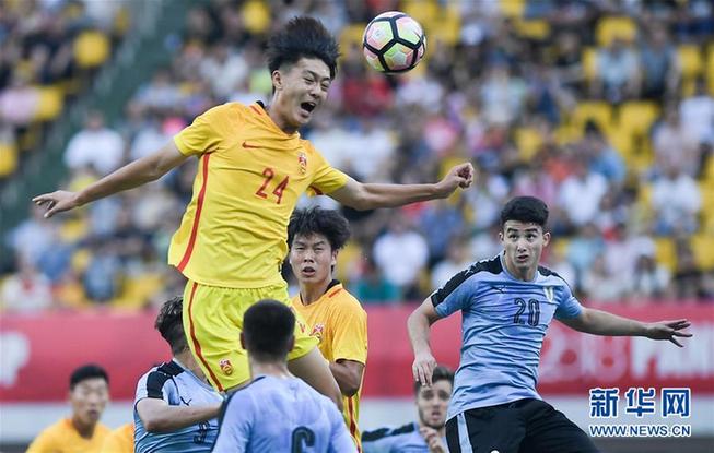 圖為2018年5月27日,在四川成都舉行的2018“熊貓杯”國際青年足球錦標(biāo)賽中國U19國家青年隊(duì)對(duì)陣烏拉圭U19國家青年隊(duì)的比賽中,中國隊(duì)球員蔣圣龍(上)在比賽中爭頂。最終,中國U19國家青年隊(duì)以3比1戰(zhàn)勝烏拉圭U19國家青年隊(duì)。新華社記者薛玉斌 攝