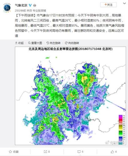 北京市氣象臺(tái)17日11時(shí)發(fā)布預(yù)報(bào):今天下午陰有中到大雨,局地暴雨,北轉(zhuǎn)南風(fēng)二三間四級(jí),最高氣溫26℃,最小相對(duì)濕度80%;夜間陰有中雨,局地暴雨,最低氣溫23℃,最大相對(duì)濕度95%。已發(fā)布暴雨黃色、地質(zhì)災(zāi)害氣象風(fēng)險(xiǎn)橙色預(yù)警。