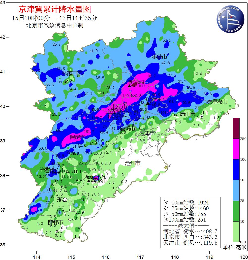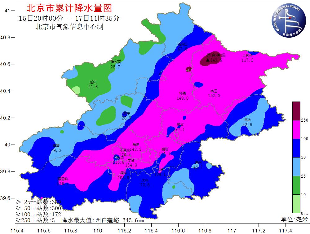 根據(jù)氣象觀測,15日20時至17日8時,北京市平均降水量達(dá)77.7毫米,城區(qū)平均100.9毫米,全市453個氣象觀測站中有121個超過100毫米、12個超過200毫米。其中,密云有2個測站超過300毫米,分別是西白蓮峪達(dá)(336毫米)和捧河巖村(302毫米)。