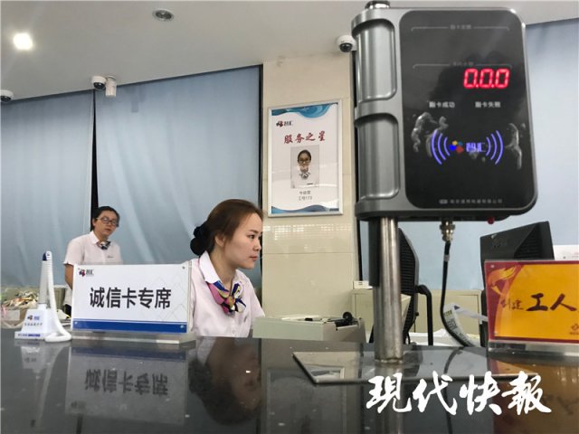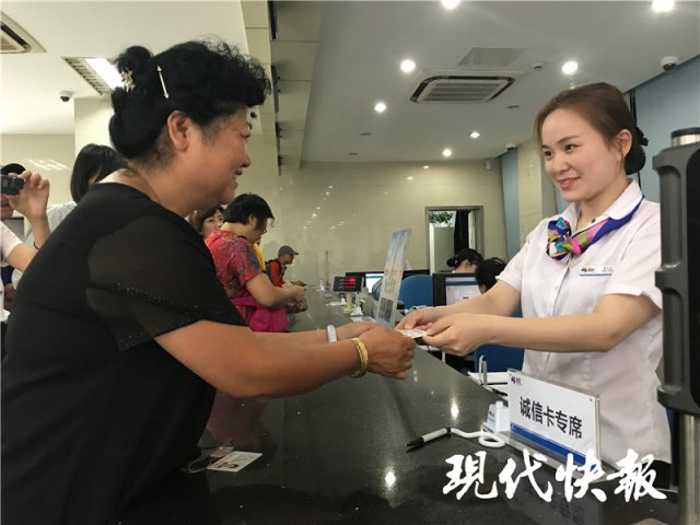 現(xiàn)代快報記者看到,周萍將市民卡交到營業(yè)人員手中,經過核驗,確認她為民政部門報送的"誠實守信好市民",點擊升級,不到1分鐘,有著就醫(yī)、乘車等功能的市民卡,就變身為"市民誠信卡"。
