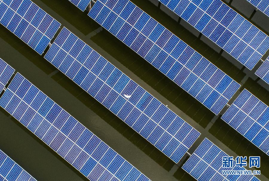 一只白鷺從光伏板上飛過(6月21日攝)。浙江省湖州市和孚鎮(zhèn)的“漁光互補(bǔ)”光伏發(fā)電項(xiàng)目建設(shè)在4200多畝魚塘上,40多萬塊太陽(yáng)能光伏板下養(yǎng)殖小龍蝦和青蝦等水產(chǎn),千畝魚塘與綠色光伏電站構(gòu)成一幅和諧的生態(tài)美景圖。 新華社記者 徐昱 攝