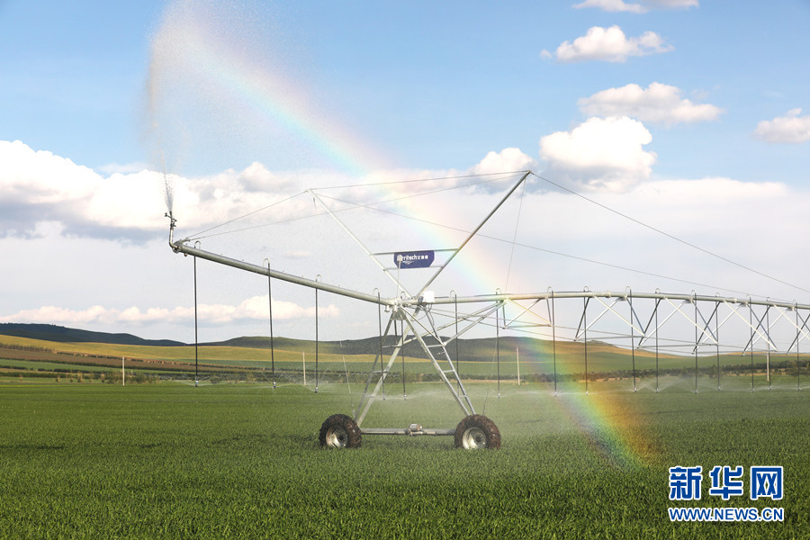 6月23日,在內(nèi)蒙古呼倫貝爾墾區(qū)蘇沁農(nóng)牧場(chǎng)的小麥地里,一輛平移式噴灌機(jī)正在田里進(jìn)行噴灌作業(yè)。(內(nèi)蒙古呼倫貝爾農(nóng)墾供圖)