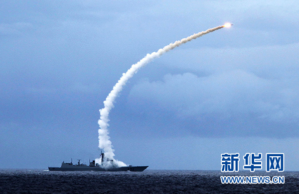 海口艦在實彈演習(xí)中發(fā)射艦空導(dǎo)彈攔截來襲目標(biāo)(2010年7月26日攝)。 新華社發(fā)