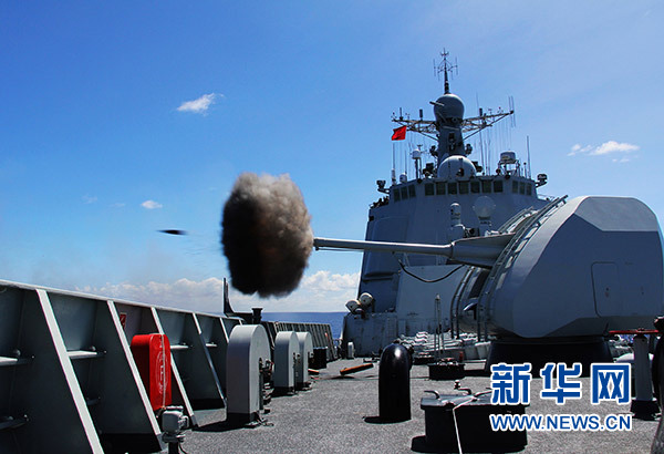 在多國聯(lián)演任務(wù)中,??谂炦M(jìn)行主炮射擊(2014年6月19日攝)。 新華社發(fā)(于林 攝)