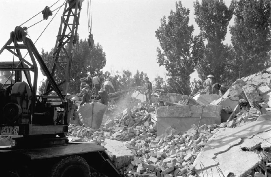 1976年7月28日,強(qiáng)烈地震中,唐山礦業(yè)學(xué)院宿舍樓被震毀。新華社記者 官天一 攝