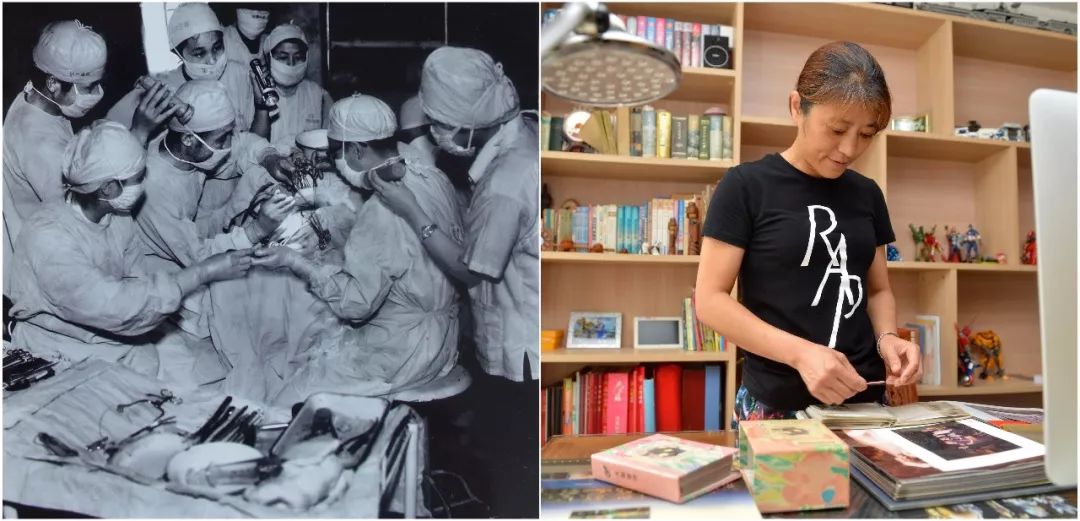拼版照片:左圖為唐山大地震發(fā)生后,上海醫(yī)療隊(duì)在給傷員做手術(shù)(資料照片);右圖為2016年7月24日,“地震嬰兒”孫滬在家中整理老照片(新華社記者 牟宇 攝)。
