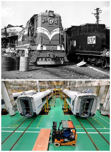 拼版照片:上圖:抗震號機(jī)車(資料圖片);下圖:2016年7月22日拍攝的中車唐山公司總裝車間一角(新華社記者 牟宇 攝)。