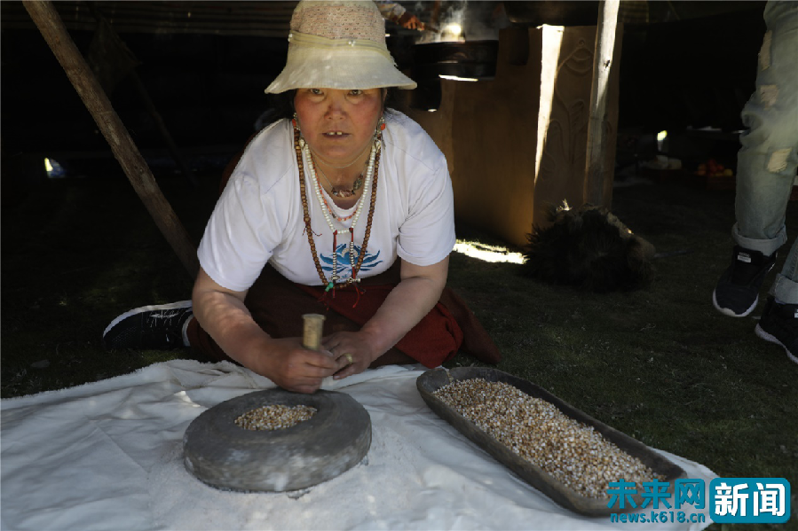 帳篷里,一位藏族阿姨正在手工磨青稞,把一粒粒飽滿的青稞磨成細細的粉,后續(xù)這些青稞粉會被進一步加工成青稞餅等藏族特有的食物。