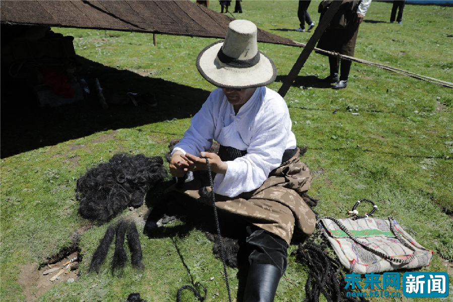 用牦牛毛編織繩子的東科日村村民。未來網記者謝深森 攝