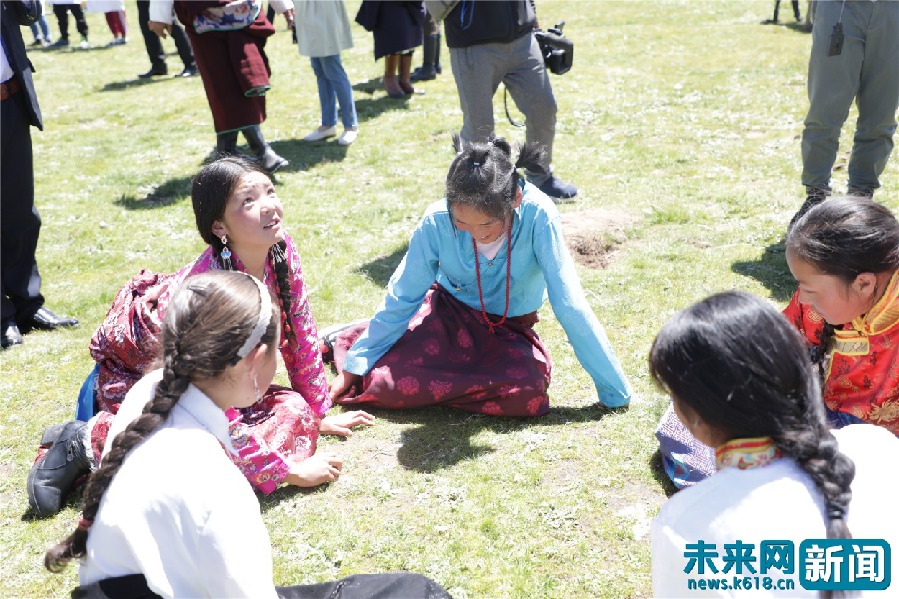 遠處,一群藏族的男孩子們在爭相騎馬和牦牛,女孩子們在玩撿石子的游戲。附近還有牧民們隨意坐在陽光下的草場上談天說地,教子下棋。