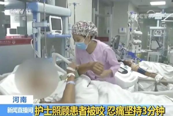 近日,在河南新鄉(xiāng)市醫(yī)學(xué)院第一附屬醫(yī)院的急診監(jiān)護(hù)室內(nèi),護(hù)士劉珊在照料重傷病患時(shí),手臂突然被患者咬住。因?yàn)閾?dān)心掙脫會(huì)導(dǎo)致病人身上的插管脫落,劉珊就一直沒(méi)有將手臂拿開。直到醫(yī)護(hù)人員給患者打了鎮(zhèn)靜劑后,患者才慢慢松開了牙齒,此時(shí)劉珊已經(jīng)堅(jiān)持了3分鐘。