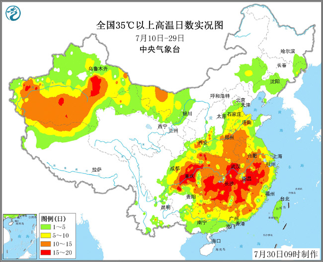 孫軍:7月10日以來(lái),我國(guó)中東部地區(qū)出現(xiàn)大范圍持續(xù)性高溫天氣,四川盆地、江南、華南以及黃淮、江淮、江漢、華北東部和南部、東北南部均有影響。其中重慶、湖北、湖南、江西、安徽、浙江中西部等地35℃以上高溫日數(shù)達(dá)10~18天。