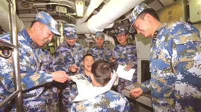 某潛艇支隊立足“百人同操一桿槍的現(xiàn)實”,堅持踐行群眾路線、密切聯(lián)系官兵。圖為該支隊某艇員隊副政委徐建鵬和戰(zhàn)士們一起開展“龍宮游戲”,以緩解深海長航帶來的巨大心理壓力,為艇員們保持良好備戰(zhàn)狀態(tài)增添動力。茆 琳攝