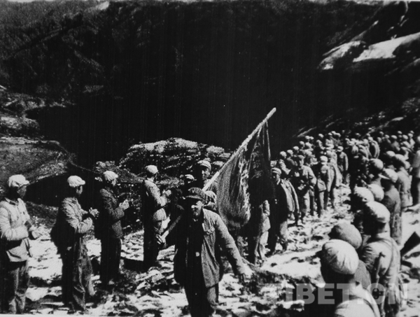 圖片為西藏文工團(tuán)老照片:第三文化工作隊(duì)向乃堆拉的山口前進(jìn),王勉之是旗手。 圖片由王勉之提供
