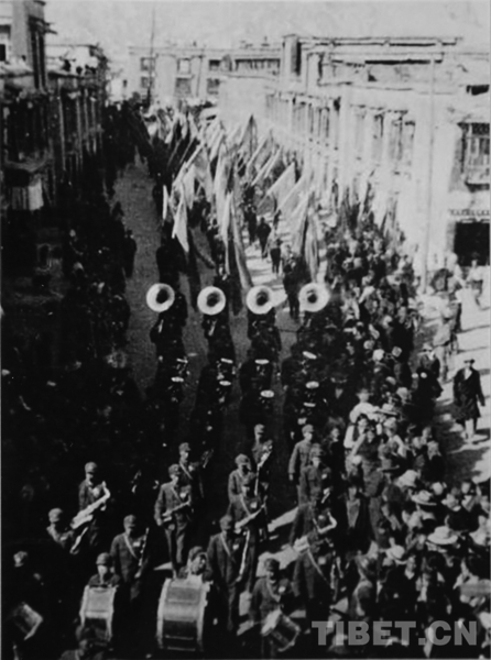 圖片為西藏文工團(tuán)老照片:十八軍到達(dá)拉薩。文工團(tuán)、軍樂隊(duì)參加入城式,行進(jìn)在八廓街。圖片由王勉之提供